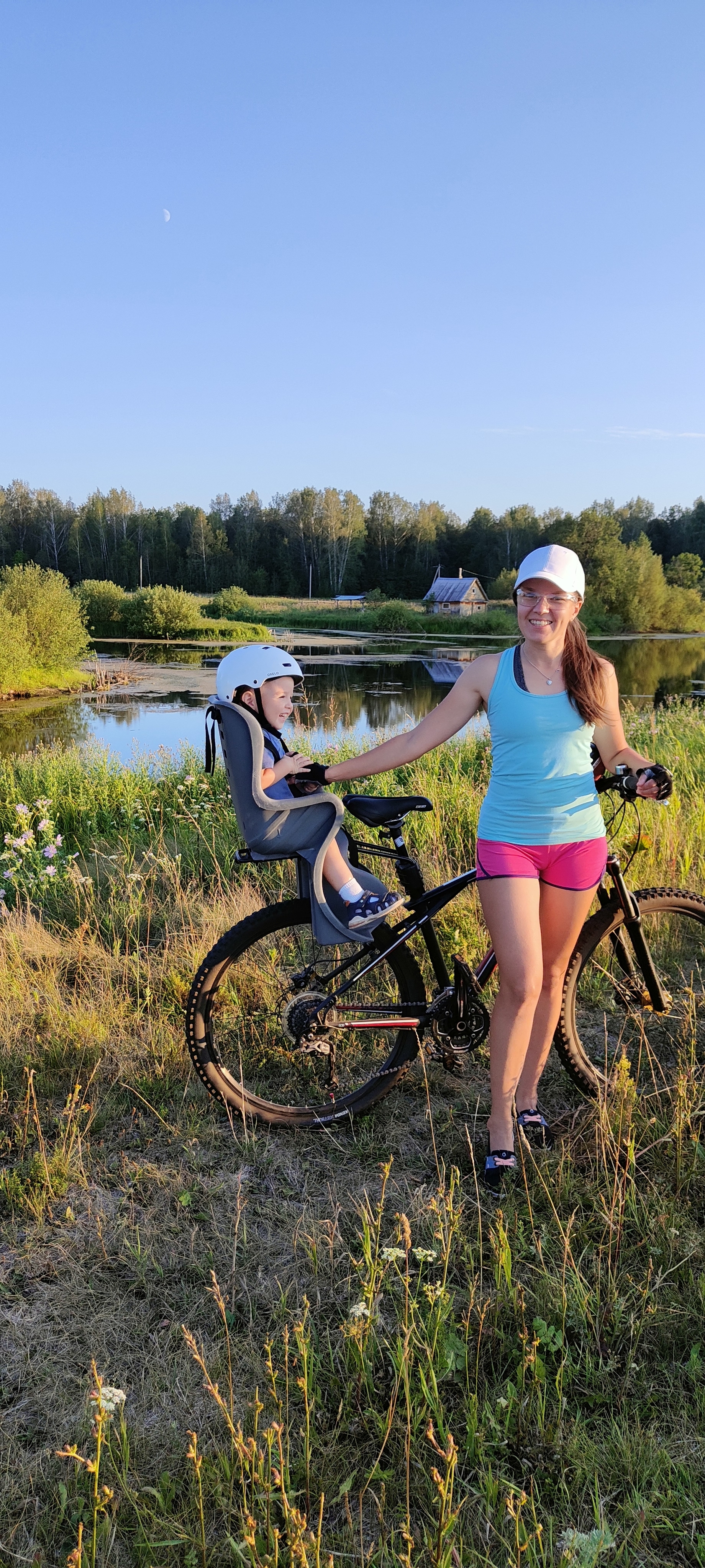 Выбор досуга за городом с ребёнком младше 2х лет скудный. Прогулки с коляской у нас возможны по одной асфальтовой улице, да и там пролетают машины и поднимаются облака пыли. В голове была мысль купить велокресло для ребёнка, но были сомнения, что вещь эта не зайдёт и будет валяться без дела. Проговорила я эту мысль подруге, а она внезапно предложила своё старое и ненужное кресло. И тут настал переломный момент в моих декретных днях сурка. Имеем «до» скучные прогулки до 1 км и «после» - прогулки до 15 км на все 360 градусов от дома! Да здравствует сосновая посадка и поле подсолнечников, которые нам видны из окна.