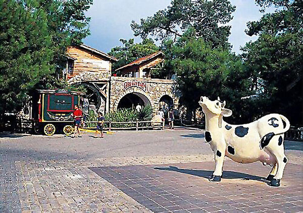 Ещё одна зарисовка. В этом отеле было много изюма, но особенно он был упорот на сельскую жизнь, в связи с этим абсолютно везде можно было встретить загородки с живностью, в основном мясо-молочного направления. Туда, куда живность не помещалась, дизайнеры наставили ростовых фигур животных, и на самой центровой площадке Фореста зафигачили статую коровы. Рассказывать про неё я не буду, после того что с ней сделал Хохол, она для меня как бы уже и не совсем корова, но я Вам её лучше покажу. Вот.