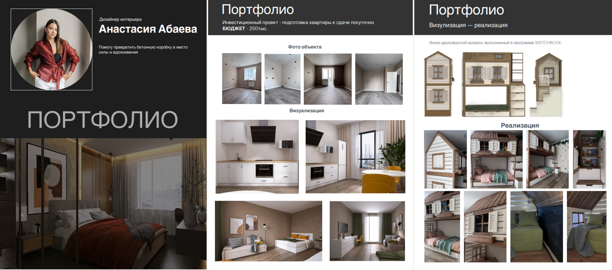 Главное — показать вкус, структуру мыслей и аккуратность. Даже небольшой сайт или презентация создают впечатление профессионального стиля и помогают поверить, что вы можете создавать качественные интерьеры уже сегодня.