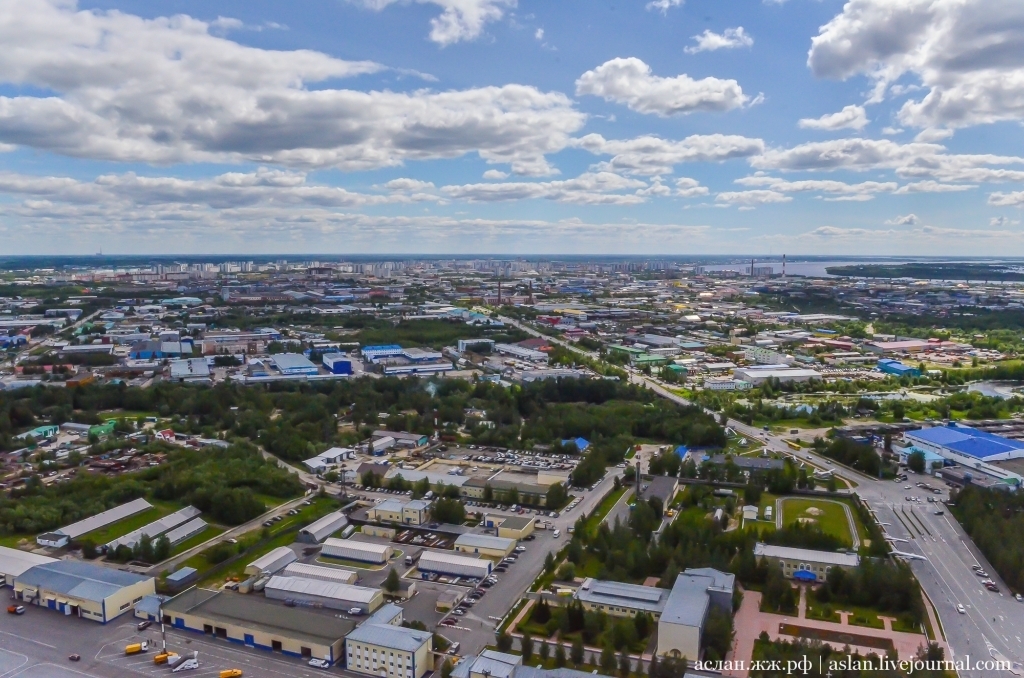 Пролетаем над городом, который был построен менее 50 лет назад для нефтяников. Город стоит на берегу довольно широкой, периодически затапливающей низменности реки Обь, а далее вокруг озера и болота. Сам город тоже отстроен на болотах, потому все здания здесь, даже 16-этажные, воздвигнуты или на насыпных песчаных основаниях, или на сваях.