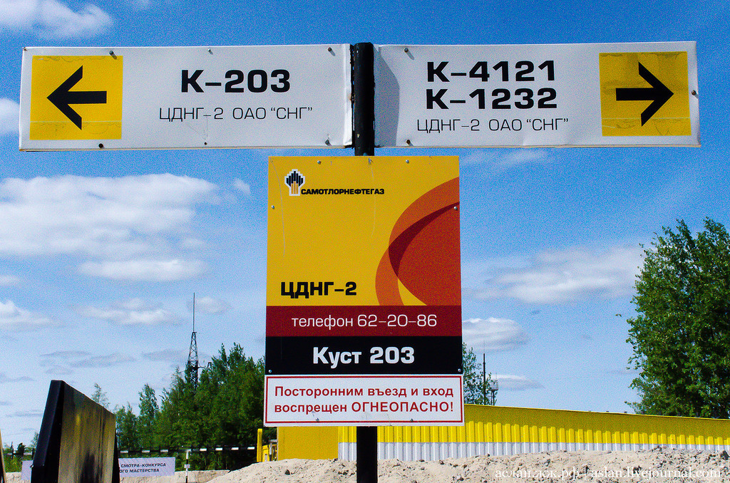 Но мы уже на земле, едем инспектировать месторождение. На территорию Самотлора не сможет въехать посторонний, мы предъявляем пропуски и мчим дальше. На обочине то и дело встречаются указатели, которые поймут только те, кто связан с нефтянкой. ДНС - дожимная насосная станция, ЦДНГ - цех добычи нефти и газа.