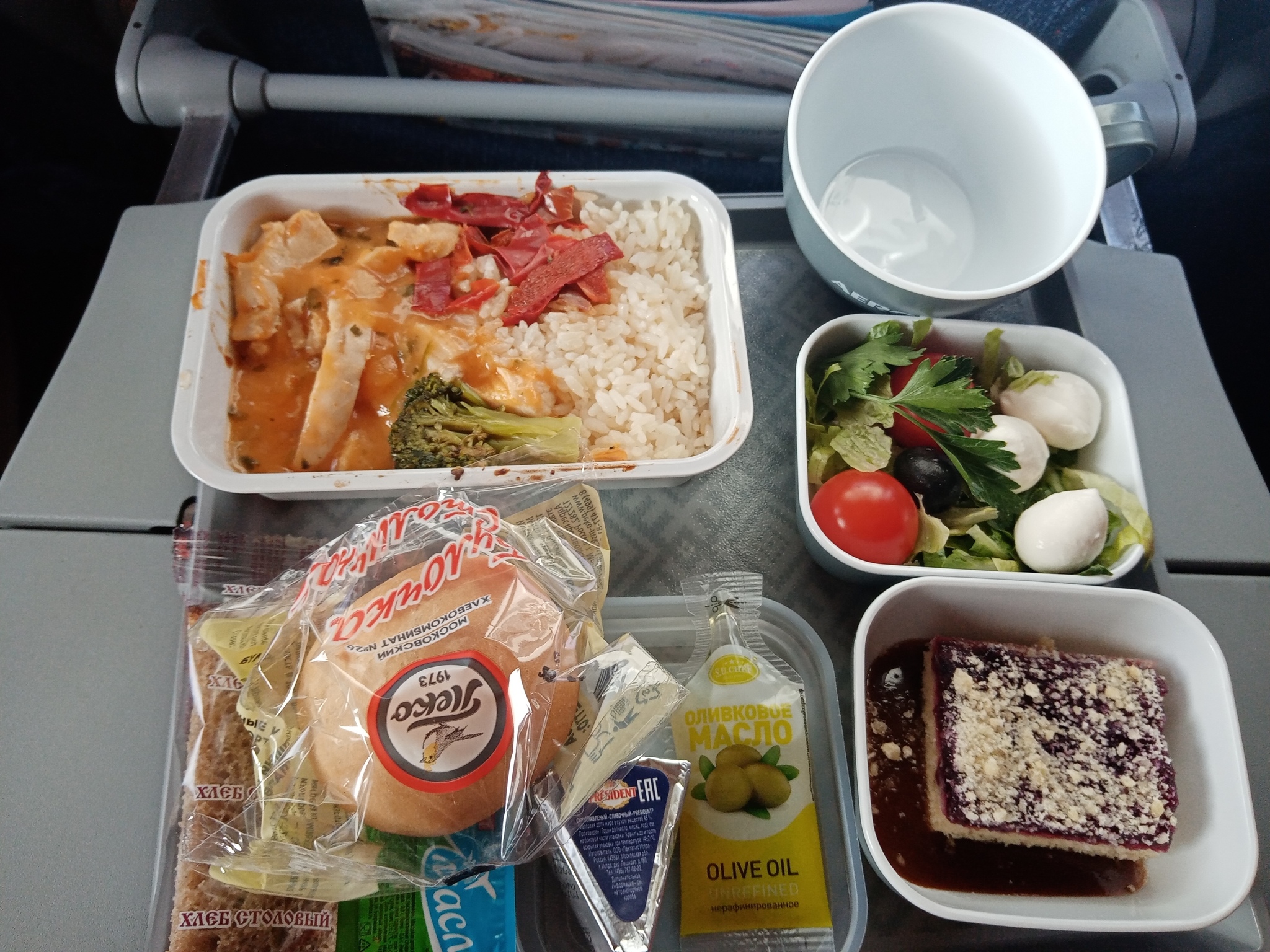 Вот такой обед подали в казахстанском лоукостере SCAT, время полёта всего-то 3 часа. Не ожидал, что вообще что-то дадут, кроме воды, а тут бац - и целый стол. Очень много всего и всё вкусное. Чесно говоря, уже забыл, когда наши авиакомпании так кормили, принаглели они в этом плане.