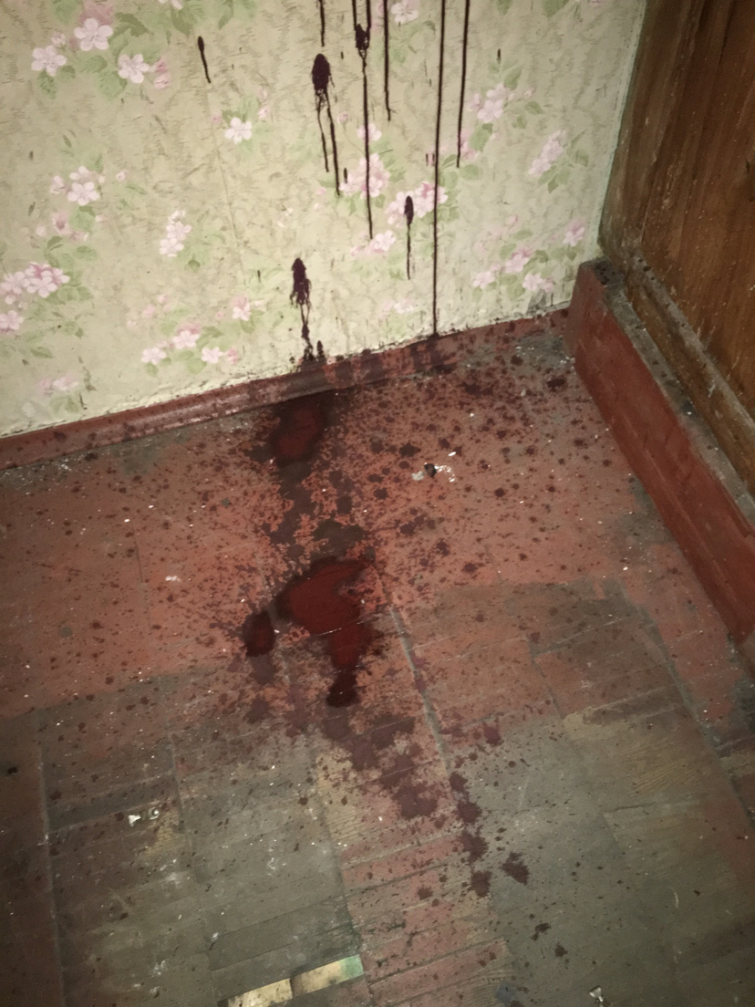 Ещё до их приезда я со своим другом нашёл подходящее заброшенное здание в городе, в которое даже днём не проникал свет из-за обшитых фанерой окон и дверей. Я проделал лаз через подвал. Тут надо сказать, что мне очень повезло: здание подходило идеально под съемки фильма ужасов) Там было три этажа, всё отсырело, обои свисало, большие комнаты. А на втором этаже к своему великому удивлению я обнаружил даже рояль (его роль оказалась в итоге колоссальной). Мы подготовили небольшой реквизит, одну комнату замазали краской, имитируя кровь (фото в конце), настроили динамик иии.... вот они приехали...))