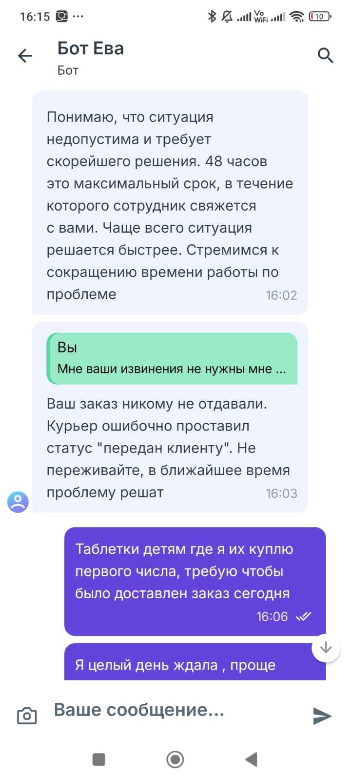 31.12.2025 у детей поднялась сильно температура, как на зло все лекарства закончились. Живем за городом, решили заказать лекарства через Еаптеку, раньше постоянно пользовались и проблем не было. Доставка быстро и удобно. Обещали привезти заказ до 17:00. И вдруг ближе к 17:00 статус доставки меняется на доставлено, деньги списаны естественно и мы сидим в недоумении. Жена пишет в поддержку, там отвечают, что курьер это сделал случайно, и доставка будет! Сидим ждем и ни ответа ни привета как говорится. Так и встретили Новый год с температурой и в плохом настроении, за что отдельное спасибо Еаптеке!!! Поддержка кормит завтраками, отправляют к старшему специалисту, но видимо тот уже наотмечался и ему срать на клиентов!)) Пришлось 1 января утром ехать в ближайшую аптеку, а это я вам скажу тот еще квест, тк ближайшее время открытия было 12:00 пришлось ждать пару часов открытия и ехать обратно, вот пол дня и прошло. Слава богу температуру сбили, детям лучше, душа спокойна. Сегодня уже вечер 2 января, мы до сих пор без лекарств от Еаптеки и без денег, вот такая история как нас ограбили можно сказать на Новый год. Будьте бдительны уважаемые читатели, везде обман в наше время!