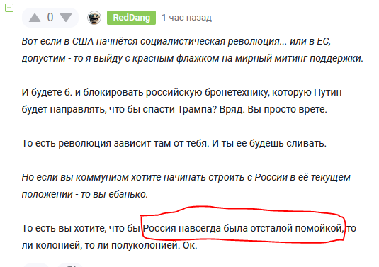 Что человек поймет? Что для защитника капитализма Россия - помойка? А раз Россия помойка, то никакая революция невозможна. Это ты хотел сказать. Ок.