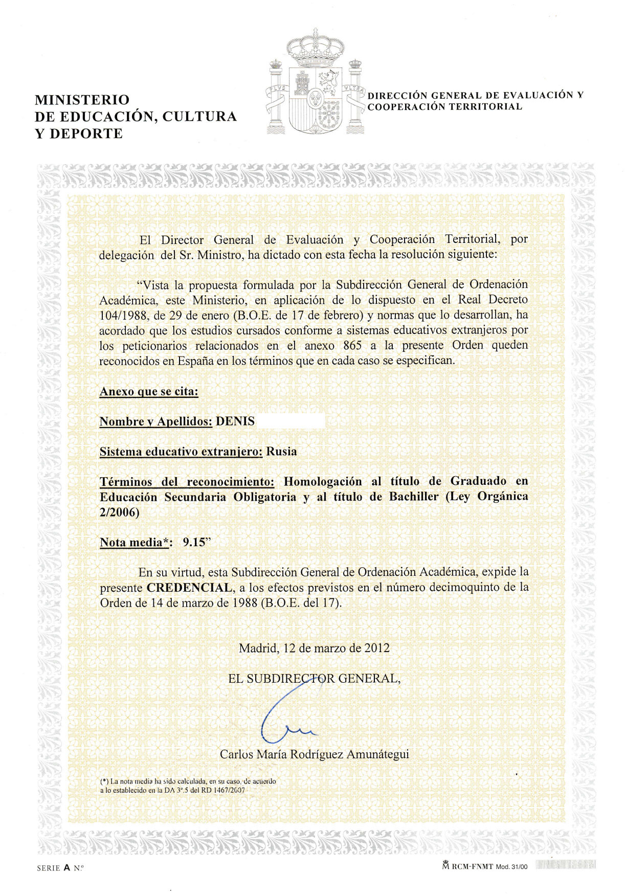Забегая немного вперед, процесс сам по себе несложный, но муторный, если вы не кропотливый человек, то вам проще нанять посредника, я же все делал самостоятельно напрямую в министерстве образования, хотя компания, которая организовала мне переезд, могла бы за меня это сделать но в итоге, как показала практика, лучше было сделать самостоятельно, так как все равно все рассматривают в Мадриде, а компания находилась вообще в другом городе страны. Лишняя трата времени на пересылку документов и потеря драгоценного времени - этот сертификат нужен к моменту регистрации на экзамены местные.
