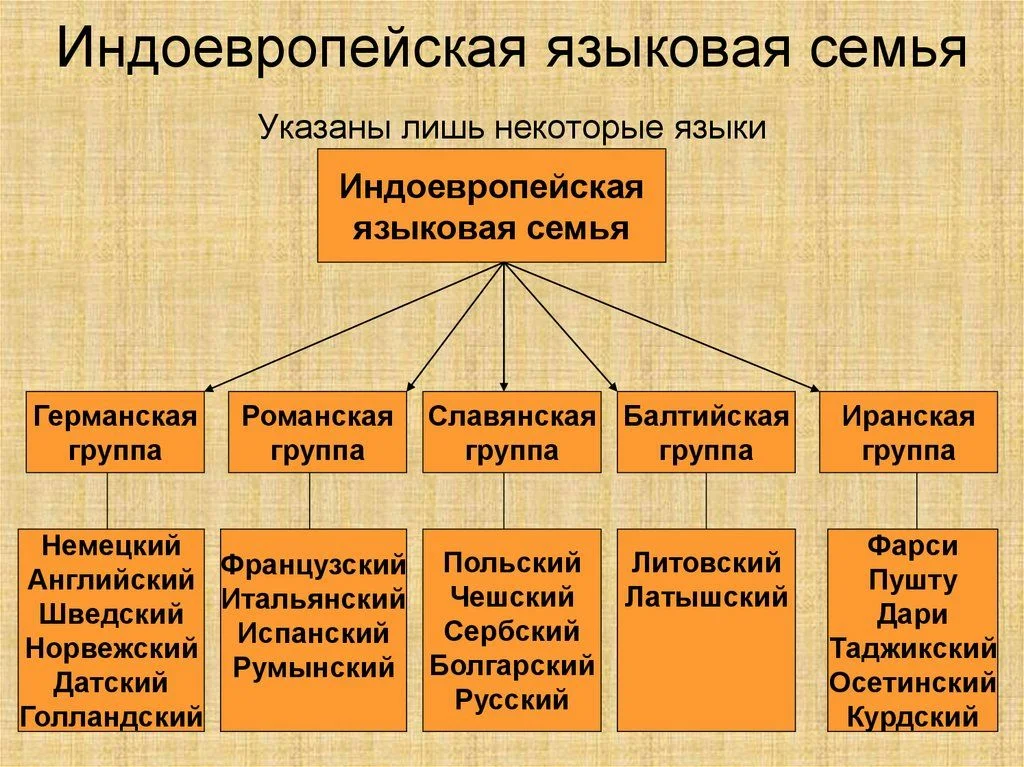 Вот, к примеру, схема индоевропейской языковой семьи, которая включает в себя родственные между собой группы языков (представлены только крупные языки индоевропейской группы):