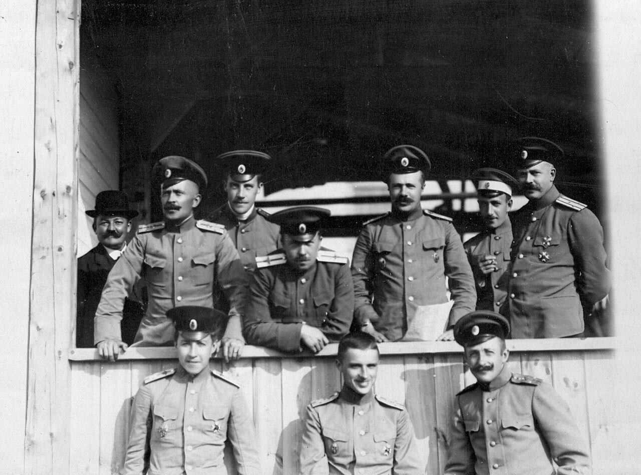 Группа военных летчиков Офицерской воздухоплавательной школы на балконе во время проведения конкурса военных аэропланов