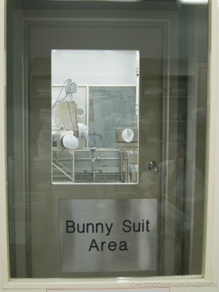 Посетители облачаются в халаты, бахилы, шапочки и проходят в шлюз. Для полной картины не хватает только масок. Весь этот комплект имеет довольно забавное название — bunny suit