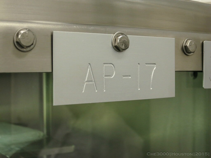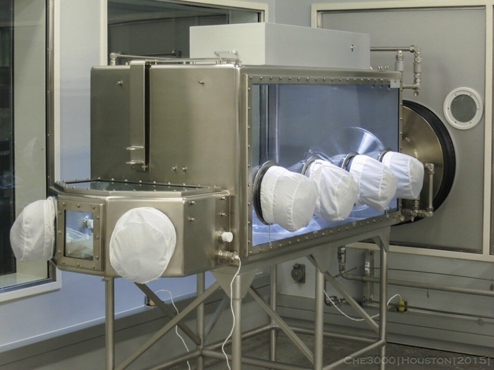 Обратите внимание на странные единицы измерения давления — дюймы водяного столба (не миллиметры водного столба, не паскали и не бары). Кстати, сейчас старое здание все еще работает и служит лабораторией для изучения свежих образцов внеземных материалов — метеоритов, комет, космической пыли. Внутри чистой комнаты вот такие вот главбоксы, от английского «glove-box», что в переводе на русский значит «перчаточный ящик».