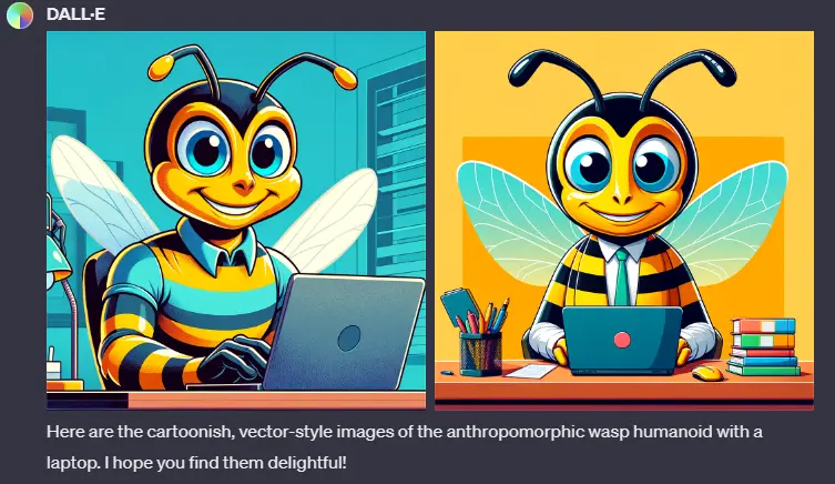 Сначала получалось откровенно не очень: я начал с простой генерации картинок с антропоморфными осами, но DALL-E решил, что это надо сделать слегка… сюрреалистично.