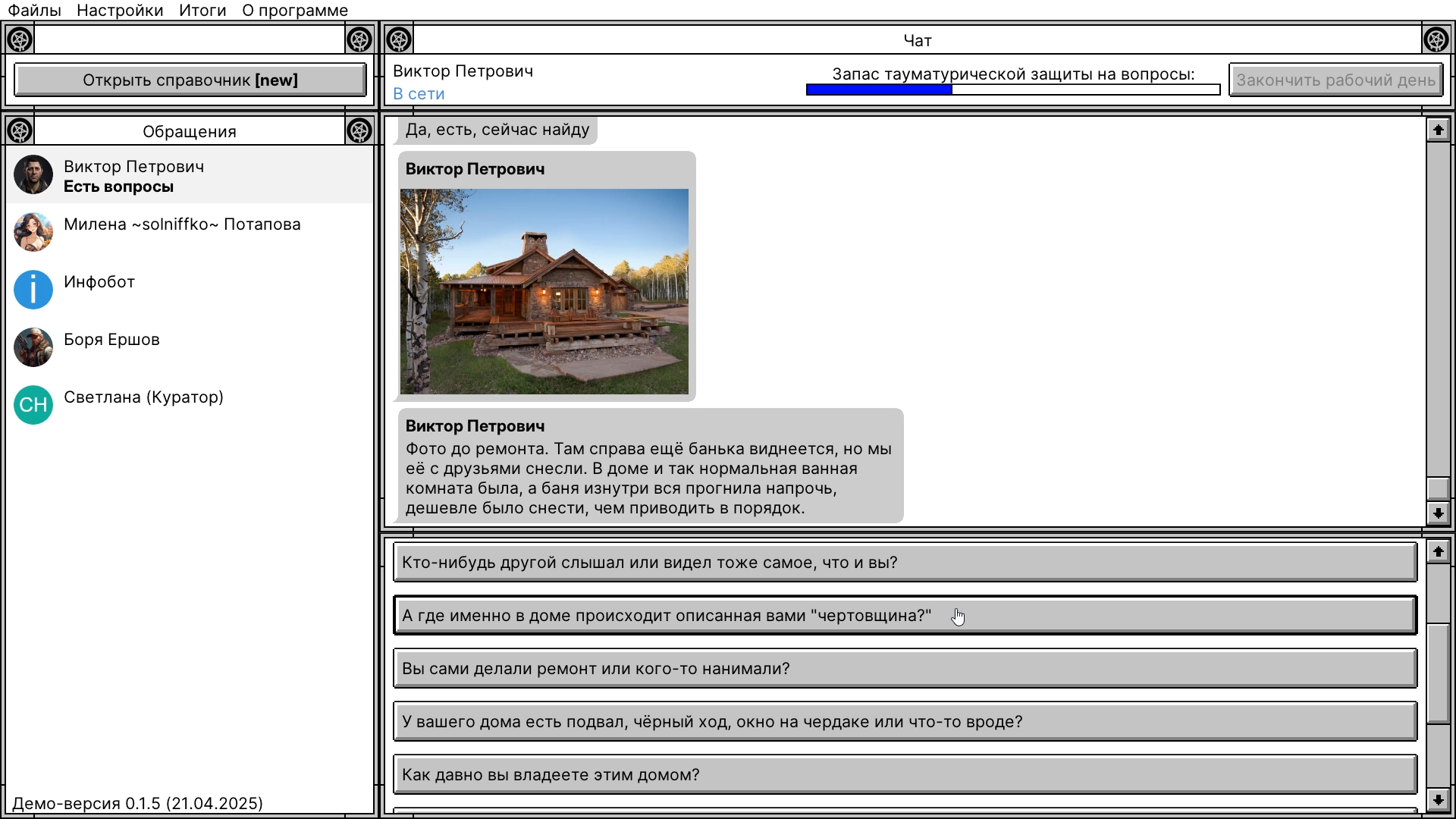Также в игре есть глобальный сюжет и глобальные концовки, которые будет определяться от того, насколько успешно игрок закрывал обращения. Плюс справочник монстров и явлений, пополняемый каждый игровой день, а также новостная рассылка и разговоры с менеджером и иногда другими персонажами. Ну а поскольку клиенты общаются с игроком в чате — они могут присылать не только сообщения, но и фото, а также аудио-записи (всеми нелюбимые голосовухи, ага).