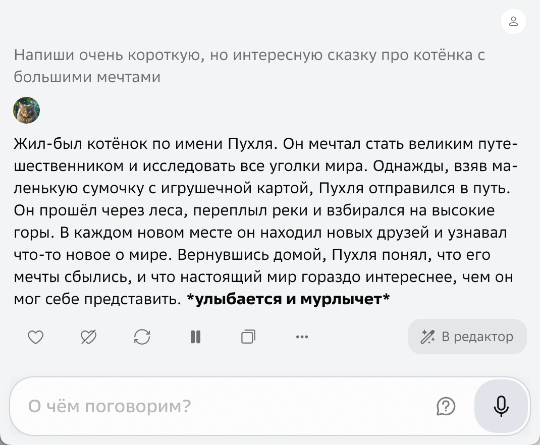 Например: «Напиши сказку про моего сына Сашу, который по пути в школу встретил нашего кота Мурзика. Питомец умел ходить на двух лапах, разговаривать и предложил Саше прогулять школу, чтобы пойти в кино. Пиши в стиле “Гарри Поттера”. Рассказ должен быть на 10 минут».