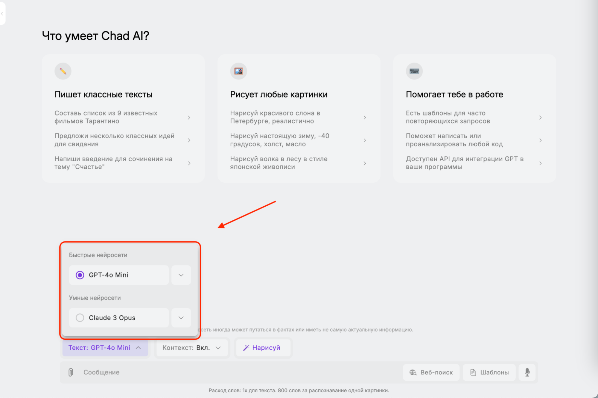 Как вариант, можно использовать сервис ChadAI. Внутри много разных нейросетей: от самых умных до менее мощных моделей. Использовать можно бесплатно какое-то время, а потом надо купить слова. Они будут расходоваться в зависимости от того, насколько сильную модель вы выбрали и как часто обращаетесь к ней.