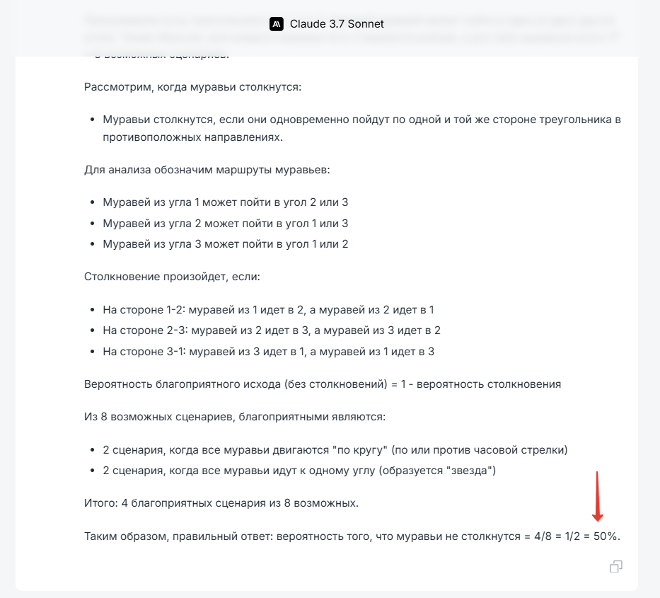 "Есть треугольник с равными углами. На углах стоят по одному муравью. В какой-то момент муравьи начинают идти в другой угол вдоль стороны треугольника. В какой именно — определяется случайно.