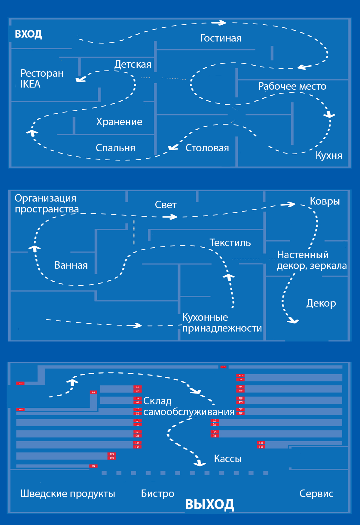С другой стороны, кто-то оценивает IKEA как «ад и кошмар». Чего только стоят эти адские планировки, когда нельзя быстро пройти из одного отдела в другой, пропустив ненужный. Вот о планировках и поговорим.