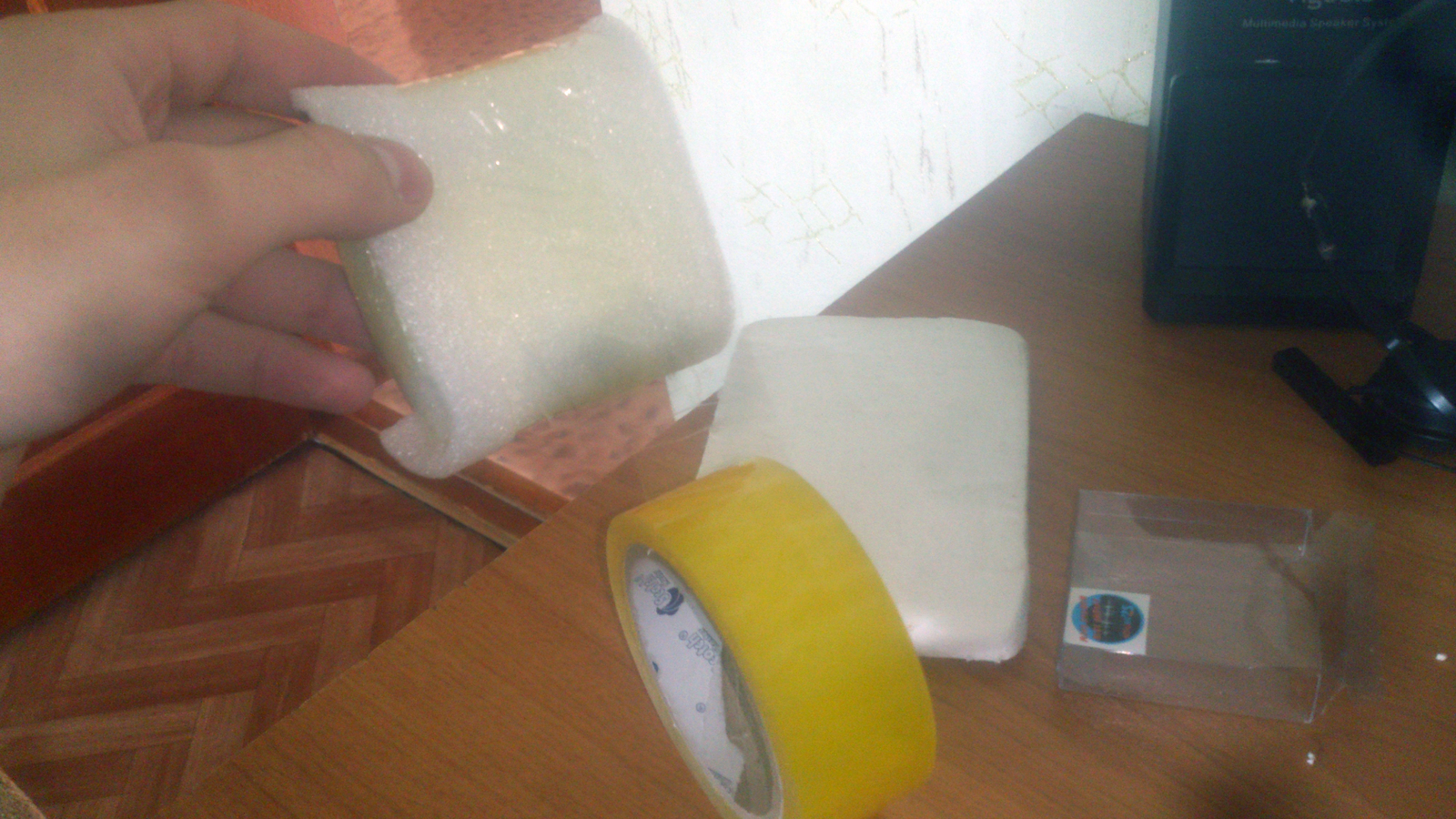 1. И так, начнем. Для начала идем и покупаем подарок (в данном случае наушники), потом случайно находим коробку из пенопласта, скотч, еще больше скотча, бумагу и немного инструмента.