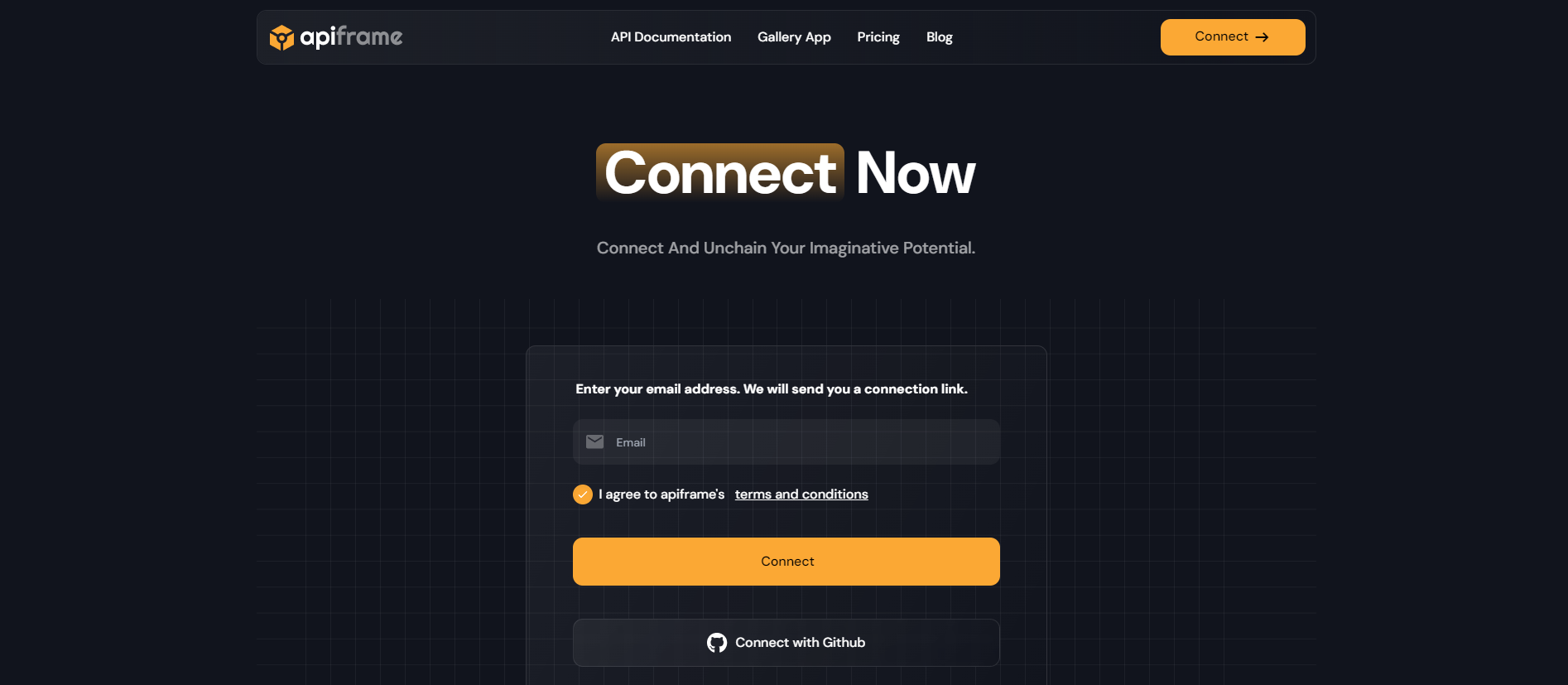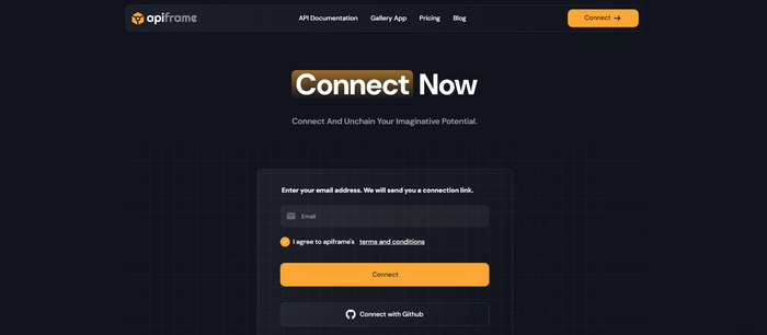 Чтобы создать аккаунт на APIFRAME и получить доступ к API Midjourney, начните с посещения сайта APIFRAME.PRO и нажатия кнопки "Connect" в правом верхнем углу. Введите свой адрес электронной почты, чтобы получить "магическую ссылку" для безопасного входа, вместо использования традиционной системы паролей. После того, как вы кликнете по магической ссылке, отправленной на вашу почту, вы автоматически войдете в свой аккаунт и будете перенаправлены на панель управления, где сможете управлять настройками аккаунта, планами, генерировать изображения Midjourney AI и получить доступ к своему API ключу.