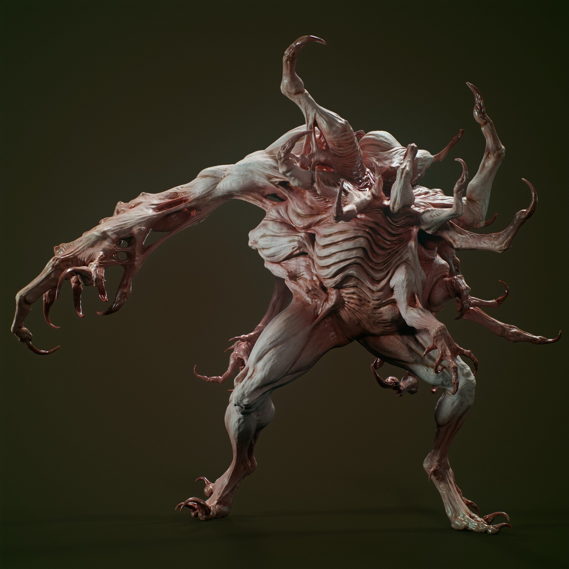 Человеческую анатомию для этого монстра сильно изменили, но ритмы тела, паттерны мышц и форм, их связь с суставами и костями дают ощущение правдоподобности. Глядя на монстра, веришь, что внутри него есть скелет, к которому крепятся мышцы.