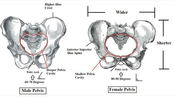 Возьмём скелет. У женщин самая широкая часть тела — бёдра из-за тазовой кости, которая больше мужской. А у мужчин — плечи. Также их грудная клетка и ключицы шире женских. Ещё одно отличие — длина ног. У женщин они короче.