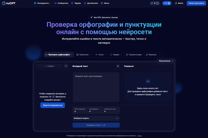 ruGPT io — это агрегатор нейросетей, который объединяет инструменты для работы с текстом в одном интерфейсе, включая проверку орфографии и пунктуации онлайн с автоматическим исправлением ошибок. Сервис позволяет быстро проверить текст на грамотность, исправить правописание, расставить запятые и улучшить структуру предложений без ручной вычитки. Нейросеть анализирует смысл текста, а не только отдельные слова, благодаря чему корректно обрабатывает сложные конструкции и сохраняет исходный стиль. Проверка подходит для любых задач — от коротких сообщений до больших статей, документов и учебных работ, при этом результат отображается наглядно с подсветкой всех изменений.