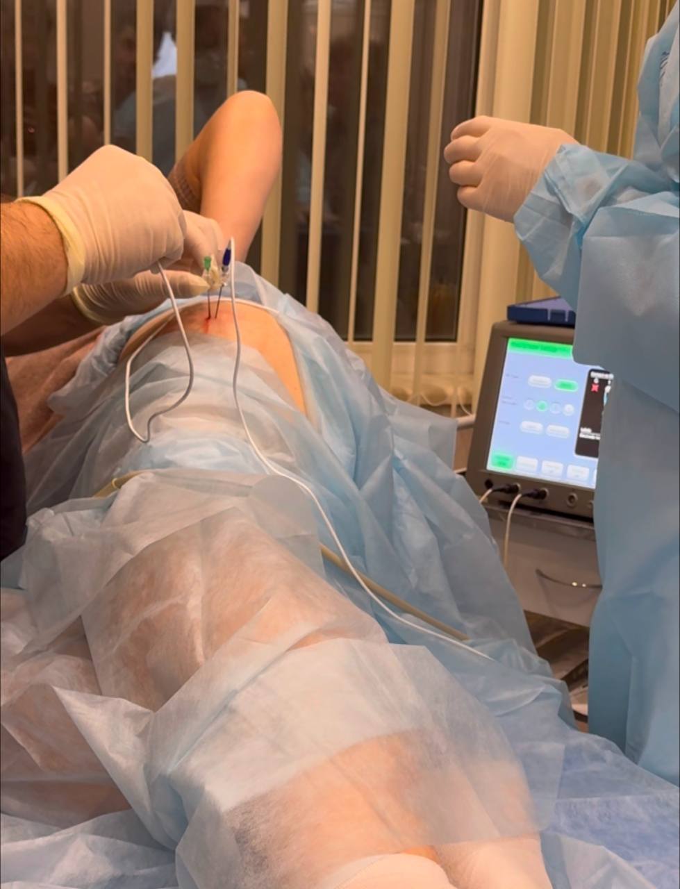 На фото — процедура радиочастотной абляции (РЧА) тазобедренного сустава. Это малоинвазивный метод лечения хронической боли, например, при остеоартрозе или других дегенеративных заболеваниях, когда другие методы (медикаменты, физиотерапия) не дают нужного эффекта.
