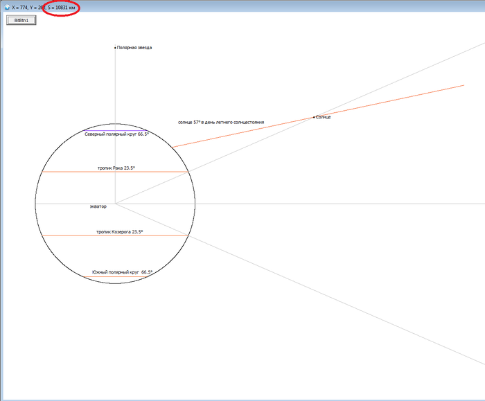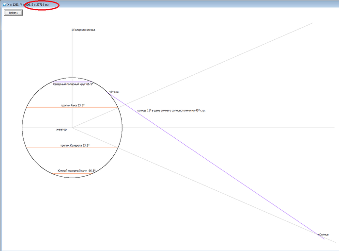 Очень сложно эти расчёты делать на песке, на бумаге, но очень просто это делать на компьютере, так как это всё-таки электронно вычислительная машина, монитор разбит на пиксели, а в масштабе у меня получилось один пиксель равен ~32 км и с помощью формулы можно найти расстояние между двумя точками координат. Формулу я сделал так, что высчитывается расстояние до мышки от поверхности Земли, мне только нужно подвести мышку к любой точке на экране и я знаю расстояние между ними. В верхнем углу видно расстояние, в день равноденствия Солнце находится приблизительно на расстоянии ~21000 км (P.S.ближе мышку не могу поднести, так как мешает наложенная надпись, но мне не надо узнать с точностью до километра, мне нужно было визуально увидеть где находится Солнце и убедиться что миллионами км тут не пахнет. Рефракцию атмосферы не учитывал так как она составляет 0.5° и сильно результат не изменит). Это как запеленговать радио шпиона. Если кто видел фильмы про войну. То фашисты чтоб узнать координаты радиоточки разведчика, высылали две машины в разные стороны которые определяли направление от куда идёт сигнал. Потом чертится две лини которые пересекаются и место нахождение приблизительно известно. Точно также определяют местоположение мобильных телефонов по двум вышкам.