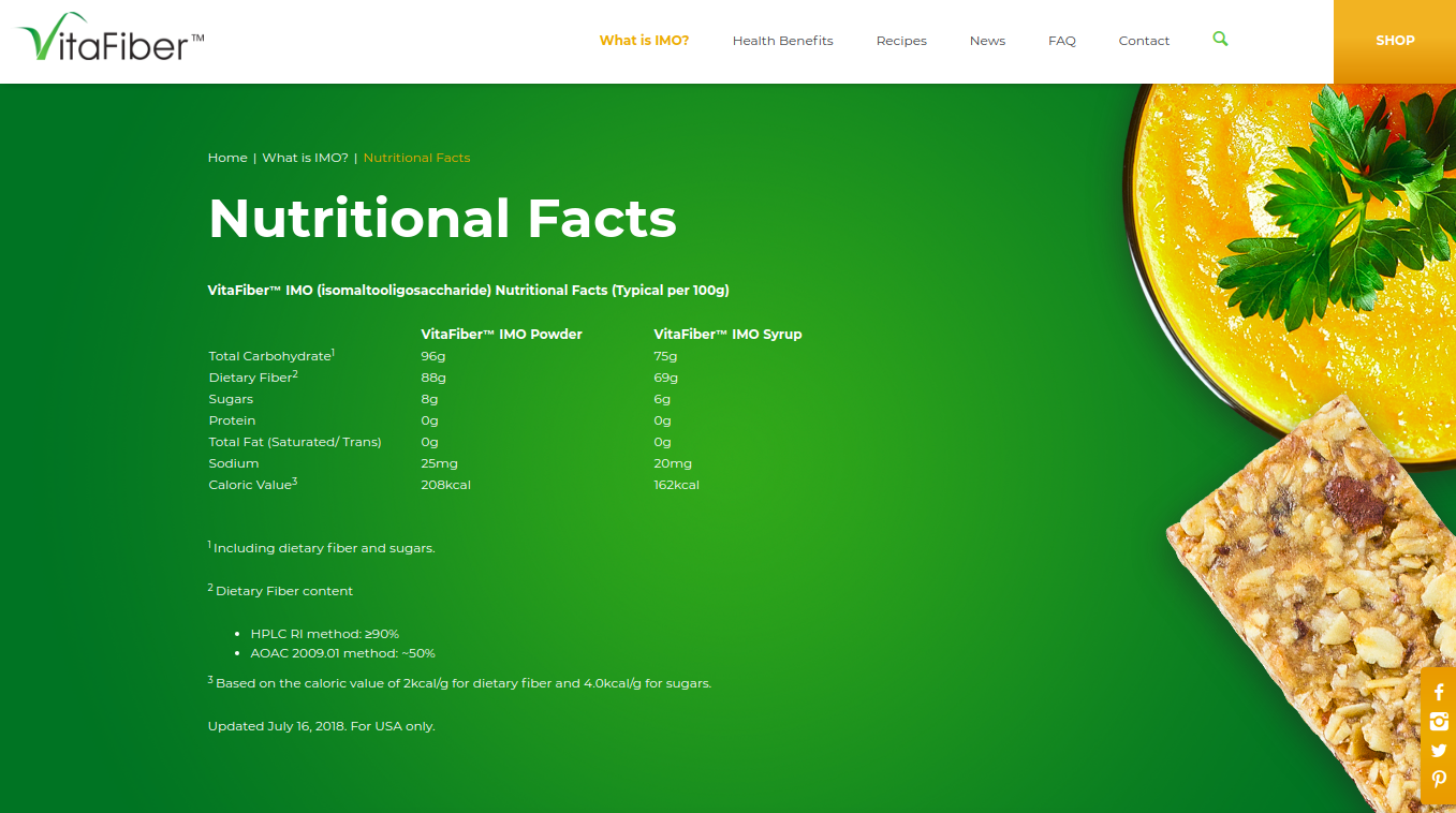 Но самое главное, ИЗОМАЛЬТООЛИГОСАХАРИД перерабатывается организмом, пусть и не полностью, но перерабатывается и в цивилизованном мире принято считать, что калорийность ИЗОМАЛЬТООЛИГОСАХАРИДа - примерно 2 ккал/г. Самый крупный розничный продавец/производитель ИЗОМАЛЬТООЛИГОСАХАРИДа в США и ЕС - VitaFiber так же декларирует 2 килокалории на грамм.