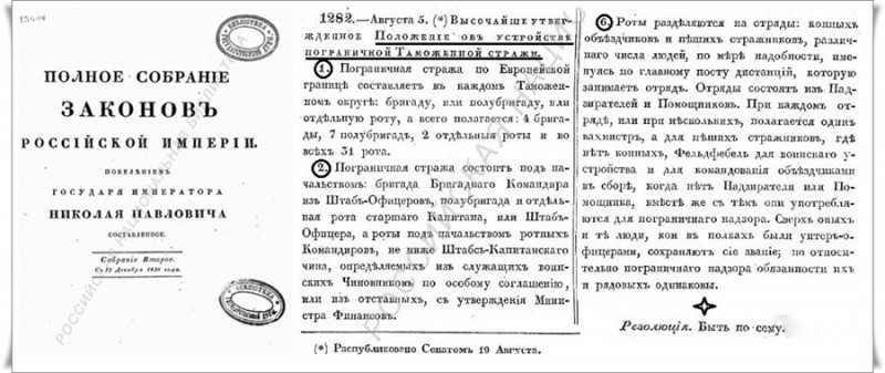 Во второй половине 1827 года по представлению министра финансов графа Е.Ф. Канкрина император Николай I повелел: «устроить новую таможенную пограничную стражу на твёрдых воинских началах», придав ей правильную военную организацию. Утверждённое новое «Положение об устройстве Пограничной Таможенной Стражи» вступало в силу с 1 января 1828 года.