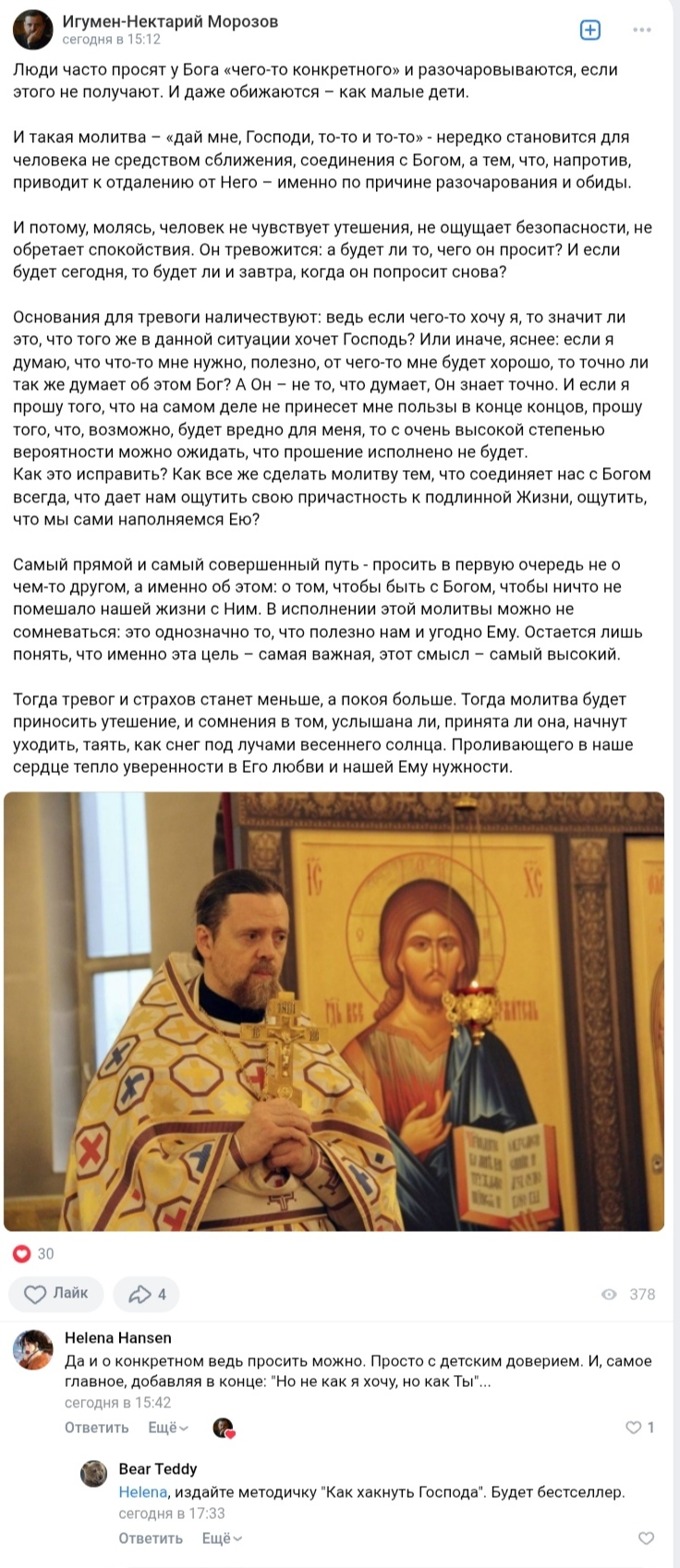 Первой комментарий к посту Нектария оставила Helena Hansen. Она оспаривает призыв Нектария не концентрироваться на мольбе о "чём-то конкретном, а лучше просить о том, чтобы быть с Богом", утверждая, что можно и о конкретном, если "завернуть молитву для Бога в другую упаковку".