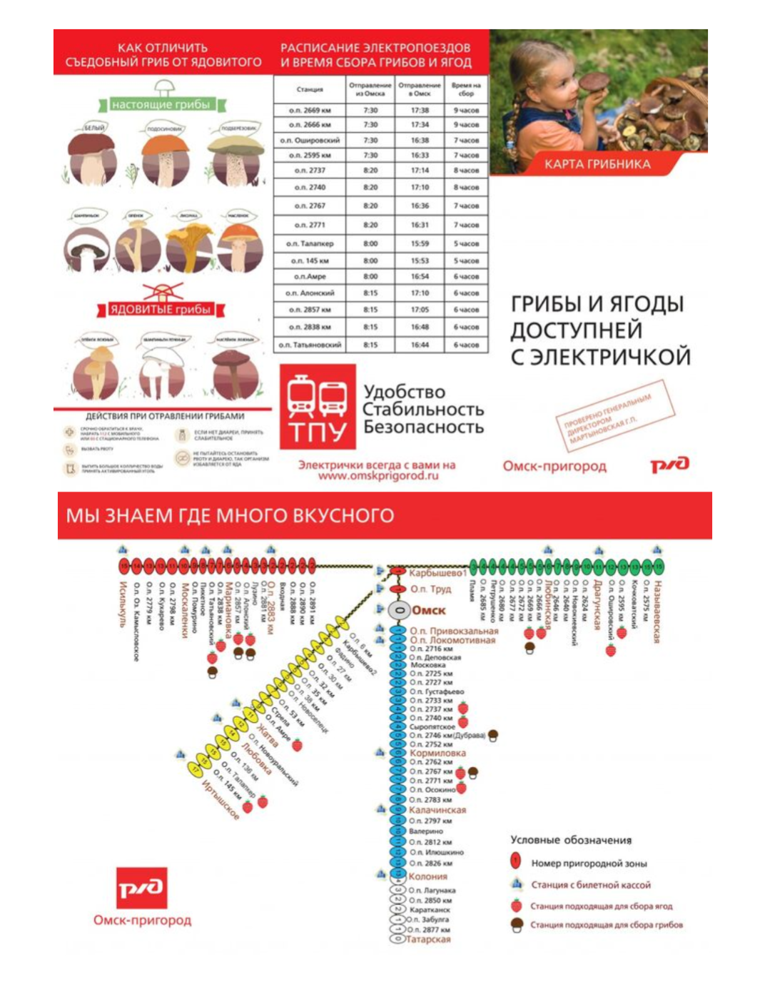 Ну а дальше все просто, оставалось только дать пассажирам инструмент, с помощью которого они эти грибы добыли бы. Электрички есть, а вот карты нет) Вспоминаем что я уже умею рисовать, делаю буклет, наношу туда остановки, на которых заходит больше всего пассажиров с грибами , организую раздачу этой карты на крупных площадках города и Профит...пассажиропоток растет, я заявляю эту акцию на конкурс , занимаю второе место в номинации "Рекламная кампания - Профессионалы".