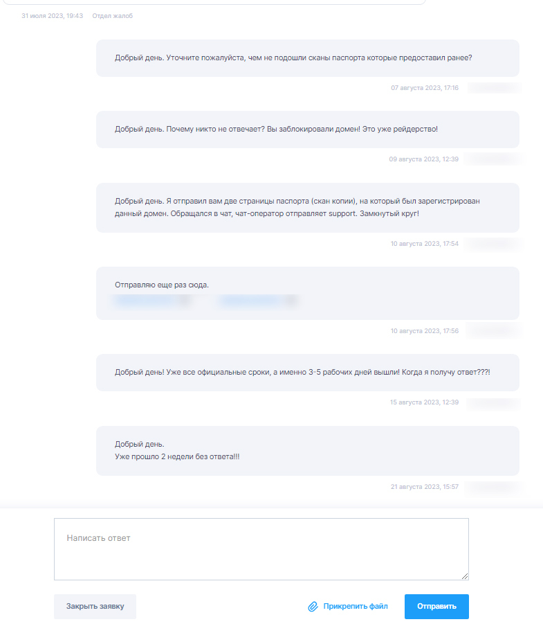 Уже пошла третья неделя как заблокировали домен. Техподдержка чата отправляет писать письма в support, а support не отвечает и вовсе.