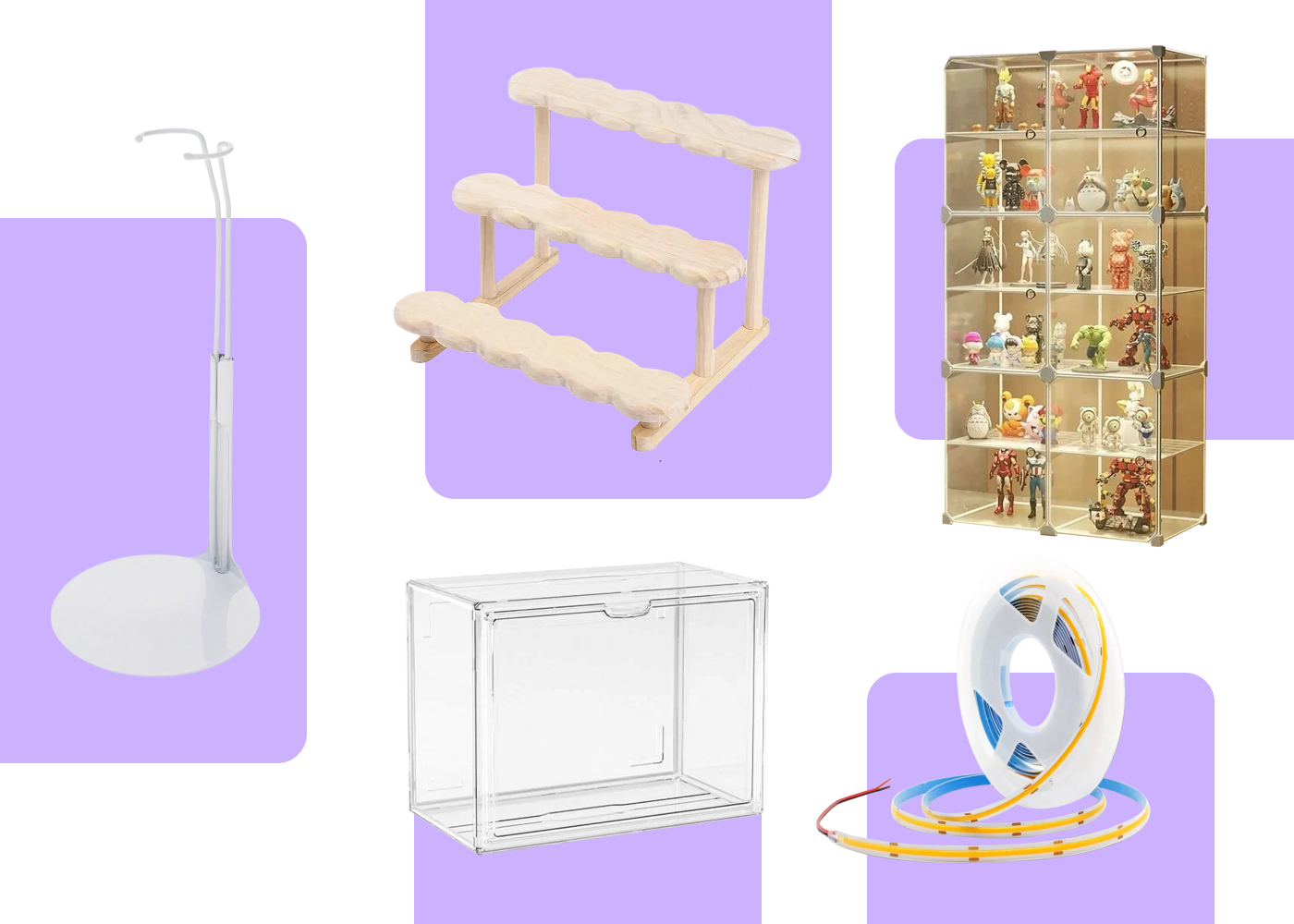 Купите подставки. Обычно коллекционные фигурки идут в комплекте с подставкой. Но ее может не оказаться, особенно если вы покупаете предметы с рук. А еще одинаковые подставки помогают избежать визуального шума.