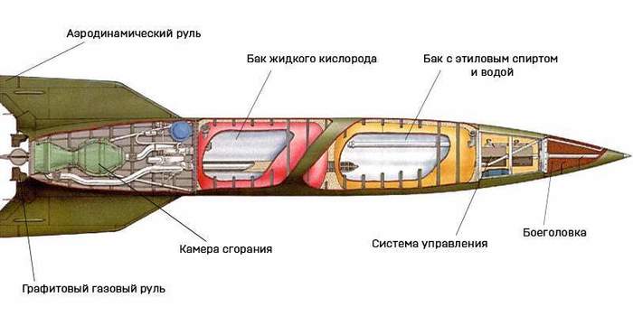 Одна ступень, 14 метров высоты, 12500 килограммов стартовой массы. Могла забросить до 1000 килограммов на расстояние 320 километров. Топливо — водный раствор этилового спирта (75 процентов, между прочим), один двигатель. Управление полётом производилось при помощи графитовых рулей, установленных в струе реактивных газов. Тяга 270 килоньютонов.