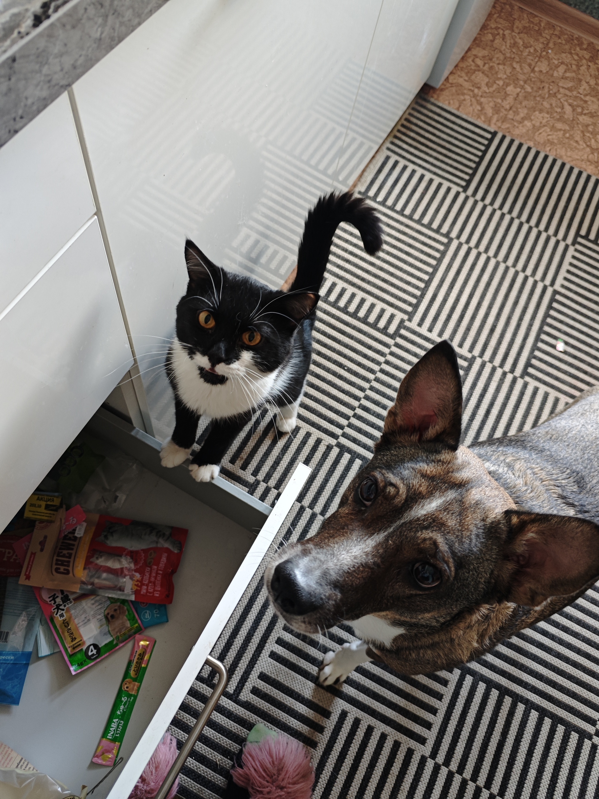 15 Demonfoxxx Как кошка с собакой 6 месяцев назад Просто хвостики. Вот так встречают с добрым утром) просто показать, ну и посмотреть на ваших) [моё] Кот Собака Домашние животные Доброта Коты и собаки вместе Ещё 0