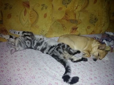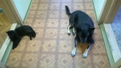 Теперь это лучшие друзья. Помню, как однажды, уходя из дома, щенка оставили в вольере, а кошку на свободном перемещении по дому. Пришли с работы, открываем дверь, а встречают нас две радостные моськи - и кошка, и собака. Квартира была не разрушена. После этого щенка в вольере не закрывали, оставляли по присмотром Баси. Она его практически усыновила, вместе играю, спят. Если собака начинает совсем уж доставать кошку - она уходит на своё место, куда пёс не может достать. Так и живут)