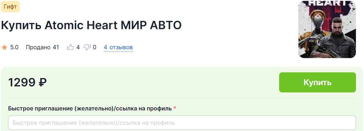 Переходим в категорию «Atomic Heart» и выбираем подходящий товар. Также, как и в предыдущем способе, смотрим на его критерии, внимательно читаем описание и оплачиваем.
