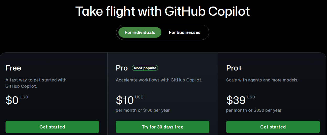 Сервис предлагает три плана для индивидуальных разработчиков. Ключевой параметр, который реально отличает тарифы — количество premium requests в месяц. Именно они открывают Copilot Chat с продвинутыми моделями, agent mode, code review и coding agent.