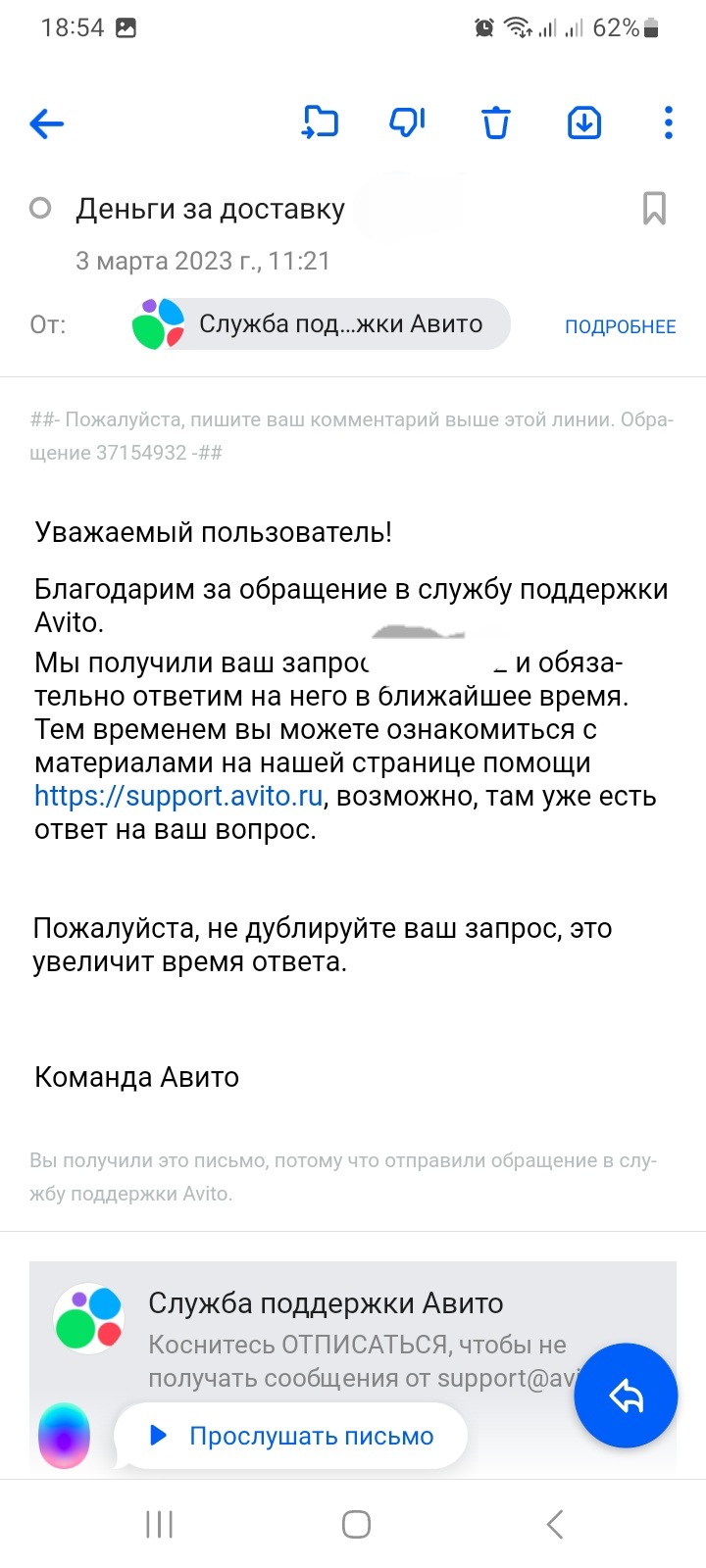 отправил значит через авитодоставку вновь детальку. На этот раз, всё проще, покупатель получил деталь. Доволен... а вон продавцу шишь. Сейчас даже поддержка молчит. Денег нет)