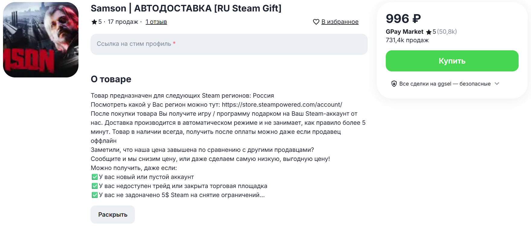 Покупка подарком или ключом для Steam на ggsel