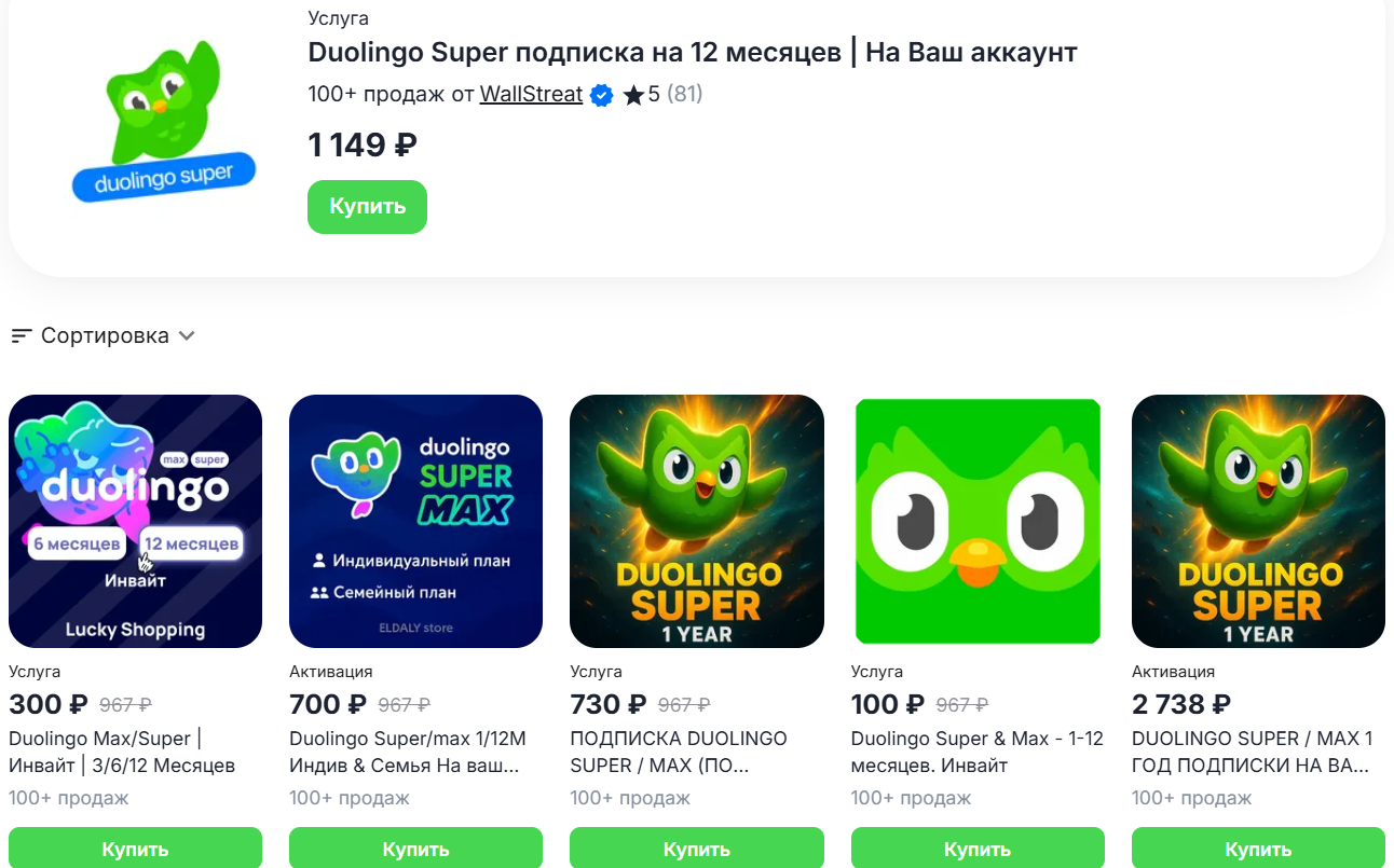 Если вы находитесь в России и хотите подключить расширенную версию Duolingo без сложных манипуляций и ограничений, одним из самых удобных способов будет покупка через площадку ggsel. Этот онлайн‑маркетплейс давно зарекомендовал себя как надежный посредник: процесс покупки занимает всего несколько минут, интерфейс интуитивно понятен, а стоимость подписки зачастую оказывается заметно ниже, чем при приобретении напрямую в зарубежных магазинах.