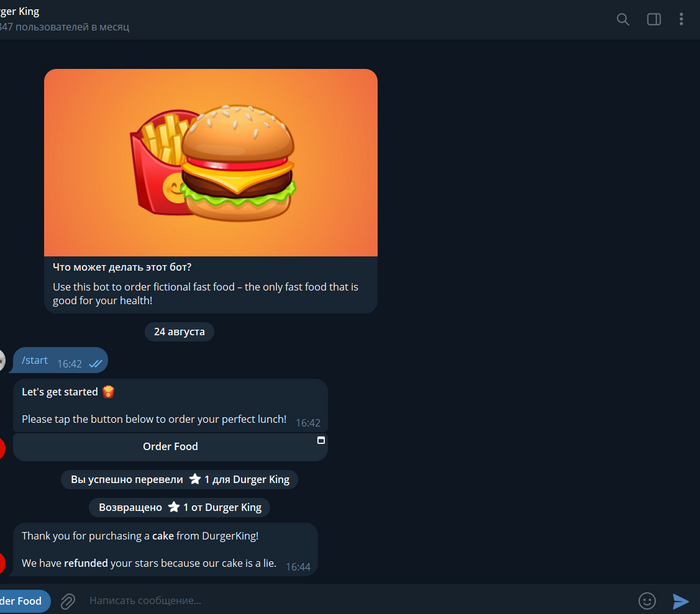 Через поиск найдите бота @DurgerKingBot.