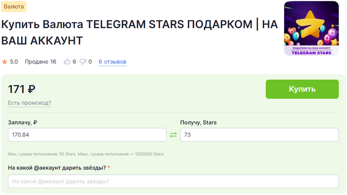 На маркетплейсе GGSel можно приобрести «звезды» подарком на ваш аккаунт. В данном случае первое пополнение куда проще способа, придуманного Telegram.