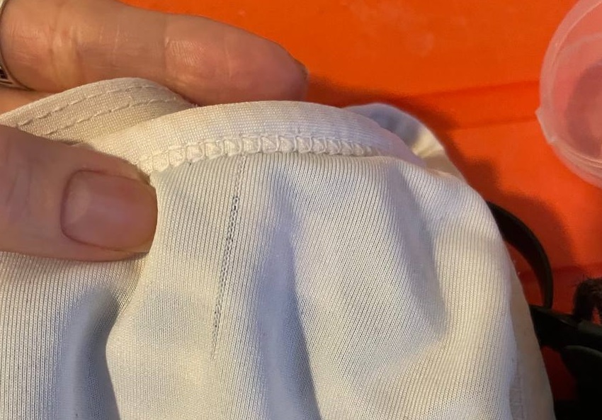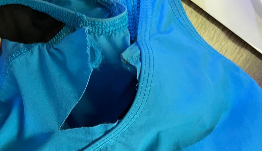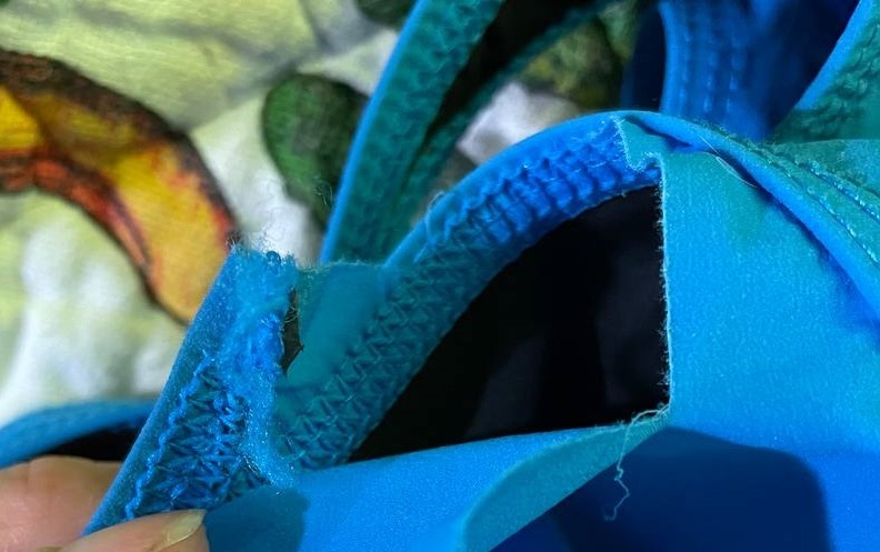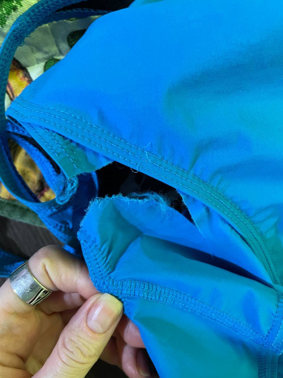 Вкупе с остальным барахлом (пловцы поймут) - яркие шапочки, купальники, вау просто. Купальник, кстати, пополз с изнанки спустя пару месяцев использования, но мы на это "забили", мало ли, цепанули. Вот, кстати, фото изнанки купальника, пополз в районе вытачки на предполагаемой груди спустя пару месяцев после использования не каждый день.