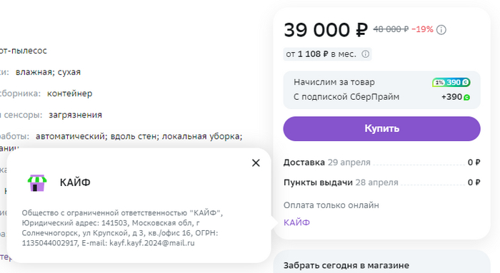 Ценник в 3 раза ниже, ООО "Кайф". И беглый гуглеж показал, что это юрлицо - ресторан. Сейчас оно называется "Монпансье", но юрлицо именно это. По телефону они подтвердили юрлицо и очень удивились тому, что от их лица кто-то торгует на мегамаркете.