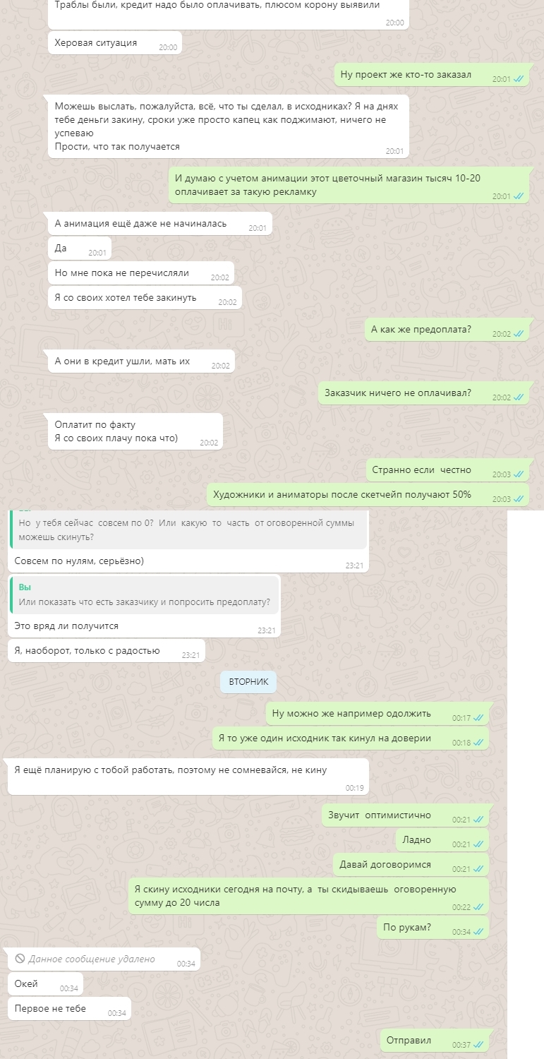 Далее заказчик Дмитрий через 1-2 дня заказывает у меня платье на другого персонажа и 2 локации, я оговариваю сумму в 900р, начинаю рисовать и через 3 часа скидываю скриншот, на что Дмитрий начинает сначала уходить в игнор, затем писать умираю от ковида на мне еще кредит висит, денег нет, давай договоримся, я пишу ок, срок до 20 числа и кидаю часть исходников, сейчас 21 мая ни объяснений, ни денег, может умер, не знаю, на телефонные звонки и сообщения не отвечает но сидит в сети. Дмитрий посредник, создает рекламный ролик для цветочного магазина https://vk.com/art_buket_kostroma я решил поговорить напрямую с заказчиком Дмитрия, возможно у него/ неё есть какое то мнение на этот счёт как вы думаете?