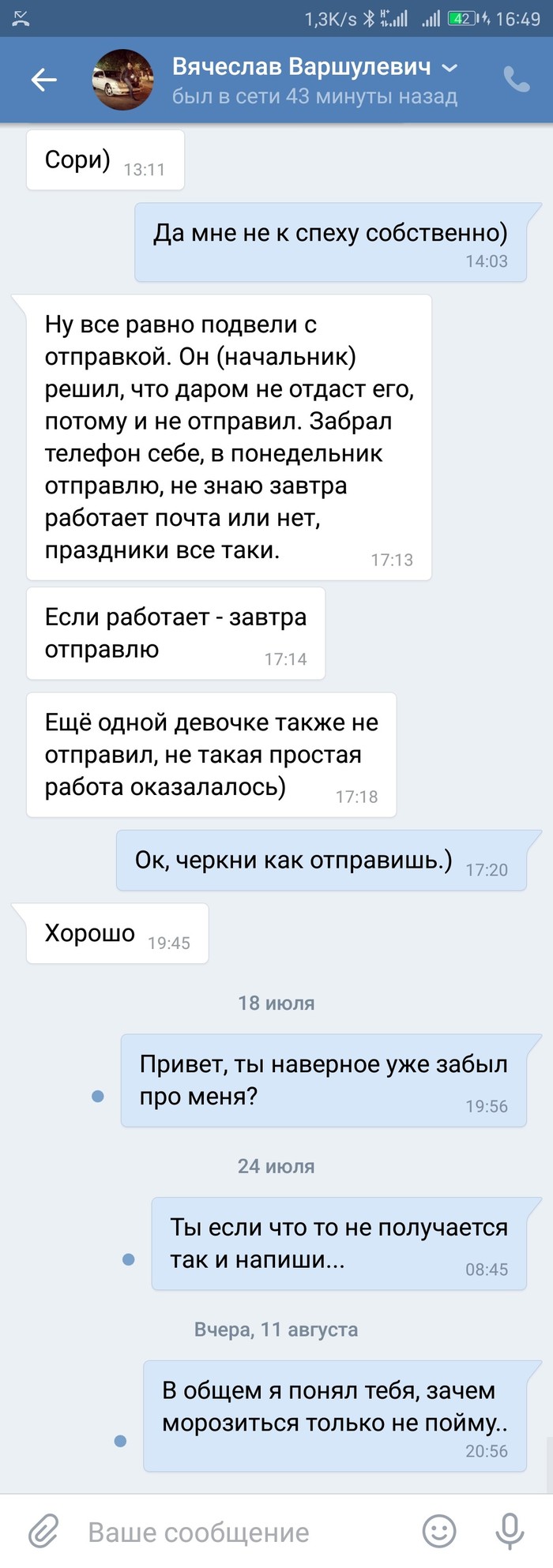 Как итог - ни завтра, ни через неделю ничего не отправлено. Плюс игнорит в ВК и почте, хотя всегда отвечал довольно оперативно, да и в ВК регулярно онлайн. Странно лишь то, что телефон у него действительно был. Но вот почему он не отправил его - загадка.