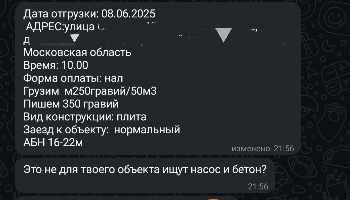 У перекупов и поставщиков есть общий чат, где они скидывают заявки. Оказалось, что Алексей просто перекуп, которых полно так же на Авито и низкую цену он даёт за счёт понижения марки бетона и обмане на колличестве. Мне очень хотелось высказать ему все, что я про него думаю. Но меня очень попросили этого не делать. Я сам строитель и смог бы определить по цвету и вязкости бетона, что марка сильно отличается. Но сколько людей уже были так обмануты.