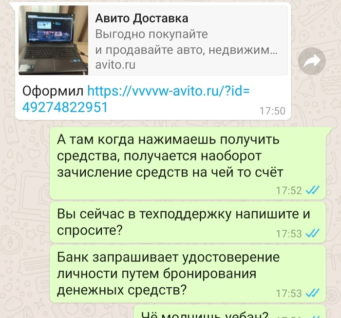Этот мошенник оказался подготовлен, у него были заготовочки на любые случаи жизни. Я ему отписал, что как-то странно что вместо получение средств, деньги кому-то должны зачислиться. На что он выдал мне что отпишет в техподдержку. Ответ не заставил себя долго ждать. Оказывается, банк запрашивает удостоверение личности путём бронирования денежных средств у продавца в размере суммы продажи, для обеспечения безопасности платежа -_- .