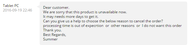 Собственно, к чему вся история. При попытке отменить заказ с причиной "Product is out of stock", продавец отклоняет запрос и присылает как-будто на автоответчике сообщение: